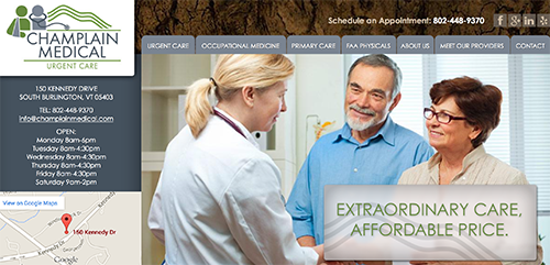 WebSight Design partnered with Champlain Medical Urgent Care to design and develop their website. We set out to create a website that outlined Champlain Medical's expertise and unique specialties, an important touch point for patients and their families, and to highlight their Burlington Vermont Urgent Care services. Champlain Medical's brand identity "Extraordinary care, affordable price" remains static on the homepage in front of a slide show that portrays the environment of Champlain Medical Urgent Care. From the homepage, visitors can learn all about this Intermediate Care clinic where patients can be seen on an as needed basis. Urgent Care is available without appointments. The staff ensures minimal wait times and delivers prompt, professional service. Champlain Medical also offers scheduled appointment times for Occupational Medicine.